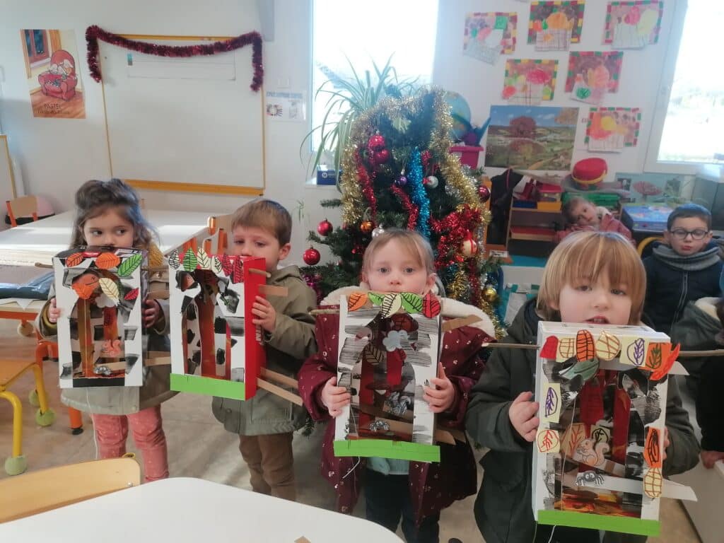 Les enfants de MS ont fabriqué une boîte à histoire. Après avoir écouté plusieurs fois « la feuille qui ne voulait pas tomber », ils ont décoré la boîte en utilisant des techniques variées ( peinture , découpage , graphisme…). Parallèlement, ils ont appris le vocabulaire et ils se sont entraînés à raconter l’histoire. Avec plaisir, ils ont apporté leur boîte aux vacances de Noël pour la raconter à la maison.